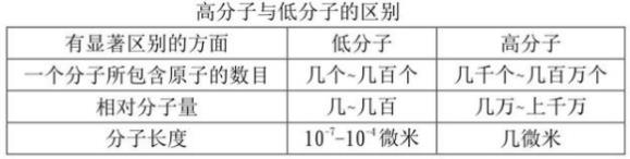 高分子與低分子的明顯差別各自反映在下面三個層面:一個分子中所包括的分子數量,分子量,分子長度。